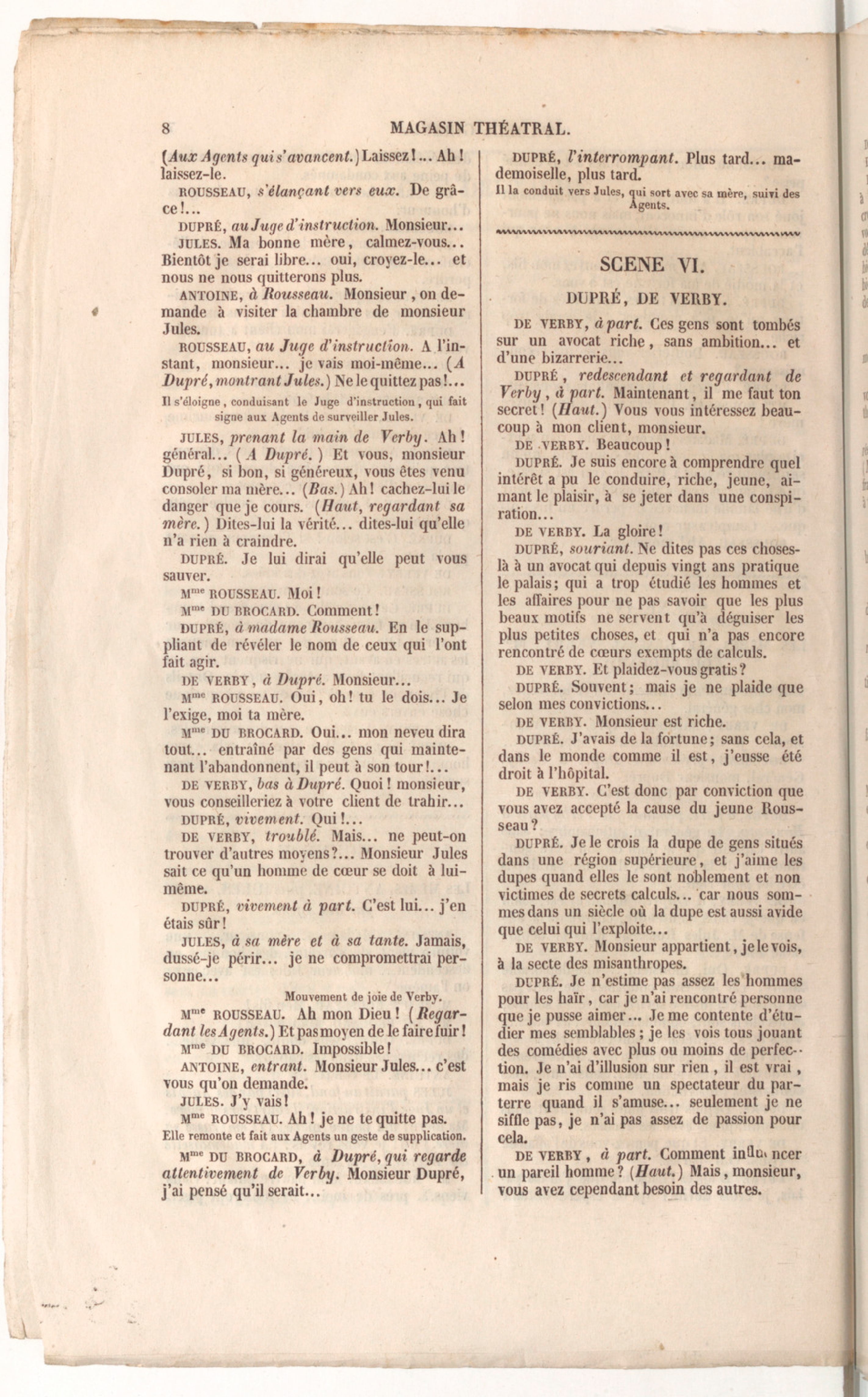 Eh bien ! (Madame du Brocard lui remet la lettre qu ’ il a demandée ; Verby lui donne la sienne ; Rousseau l’examine.) Enfin !… (De Verby lance un regard {p. 26} furieux à Dupré et à la famille, et sort vivement. À Rousseau) Et vous, monsieur ?
