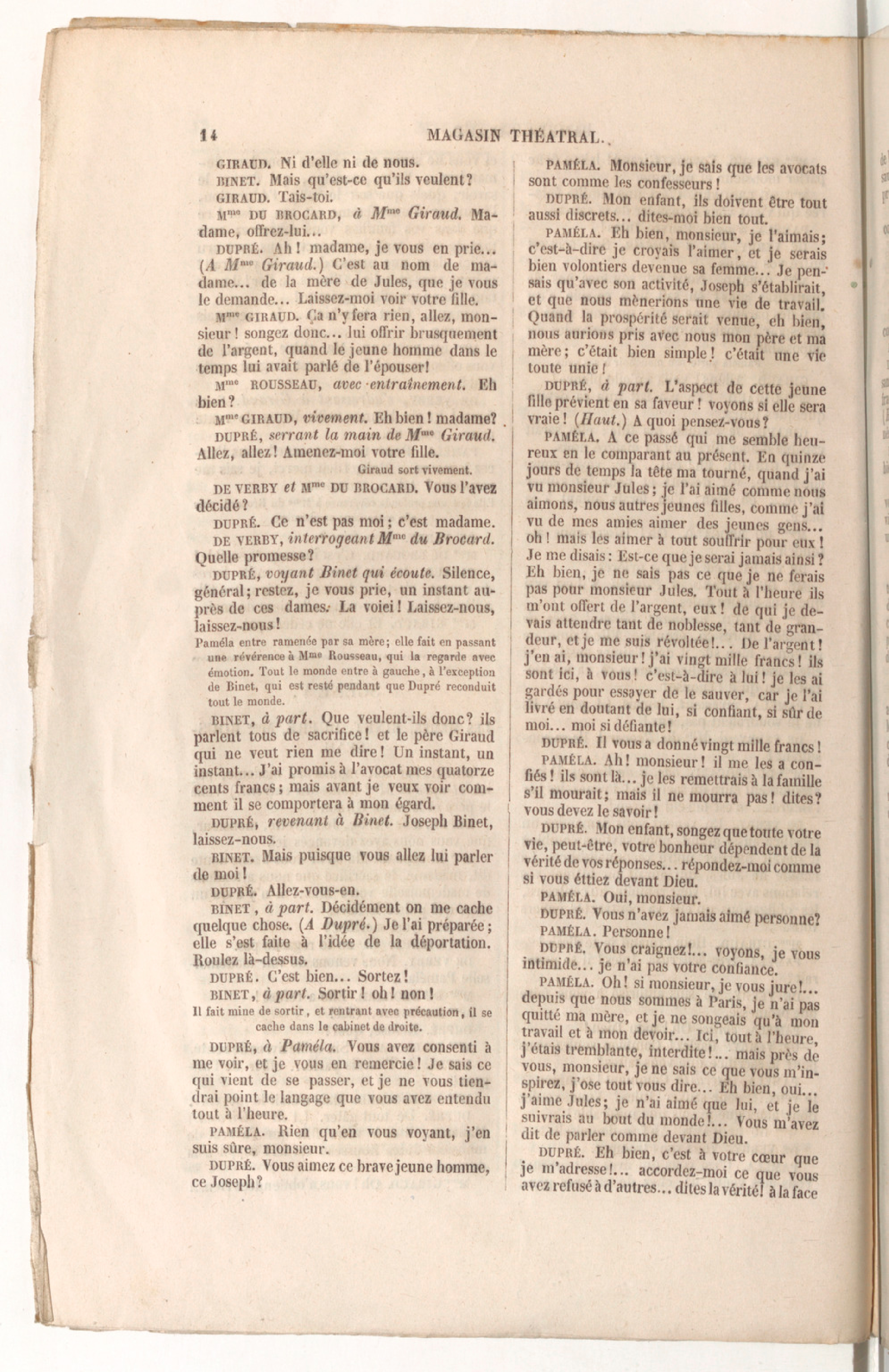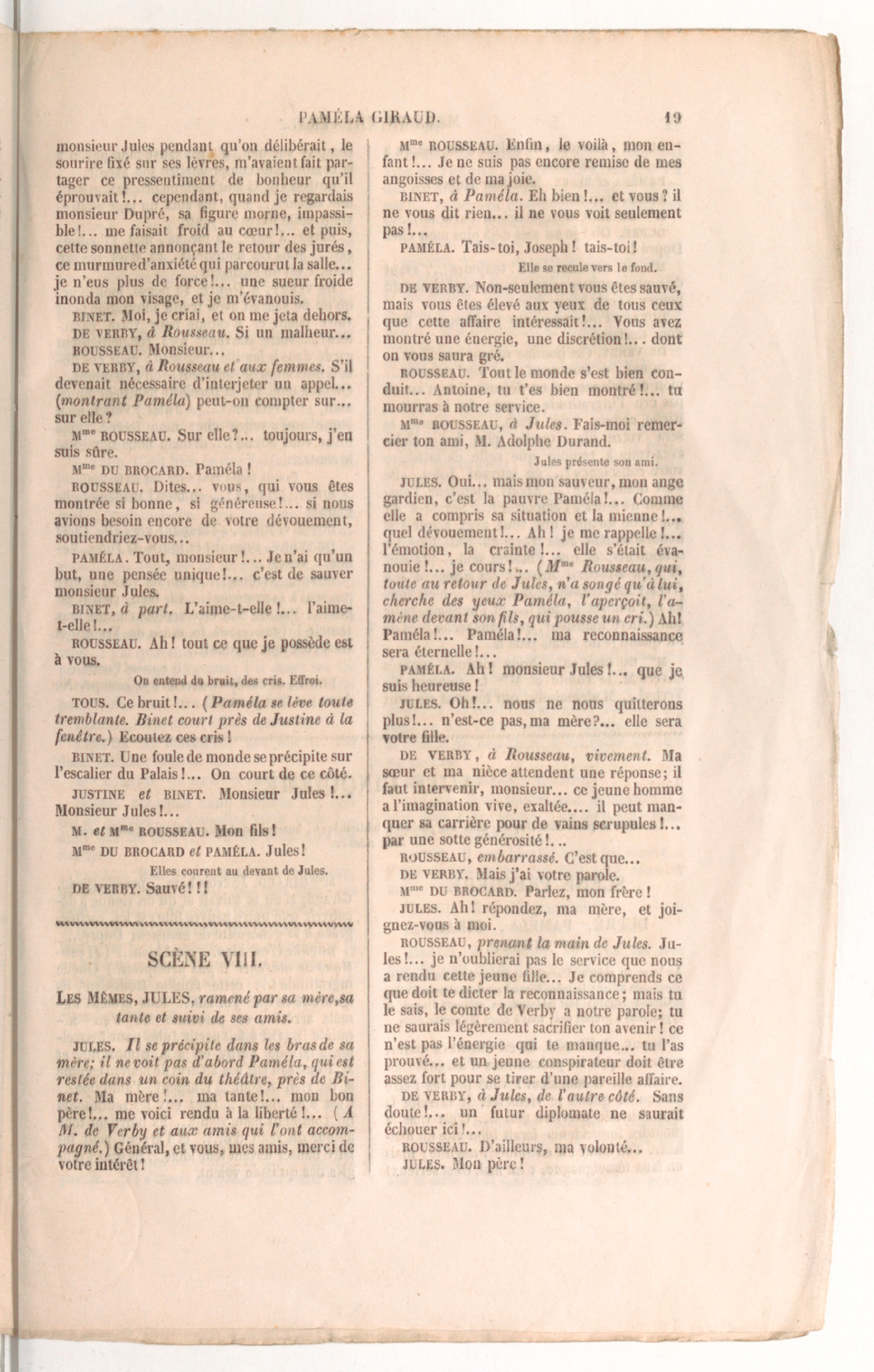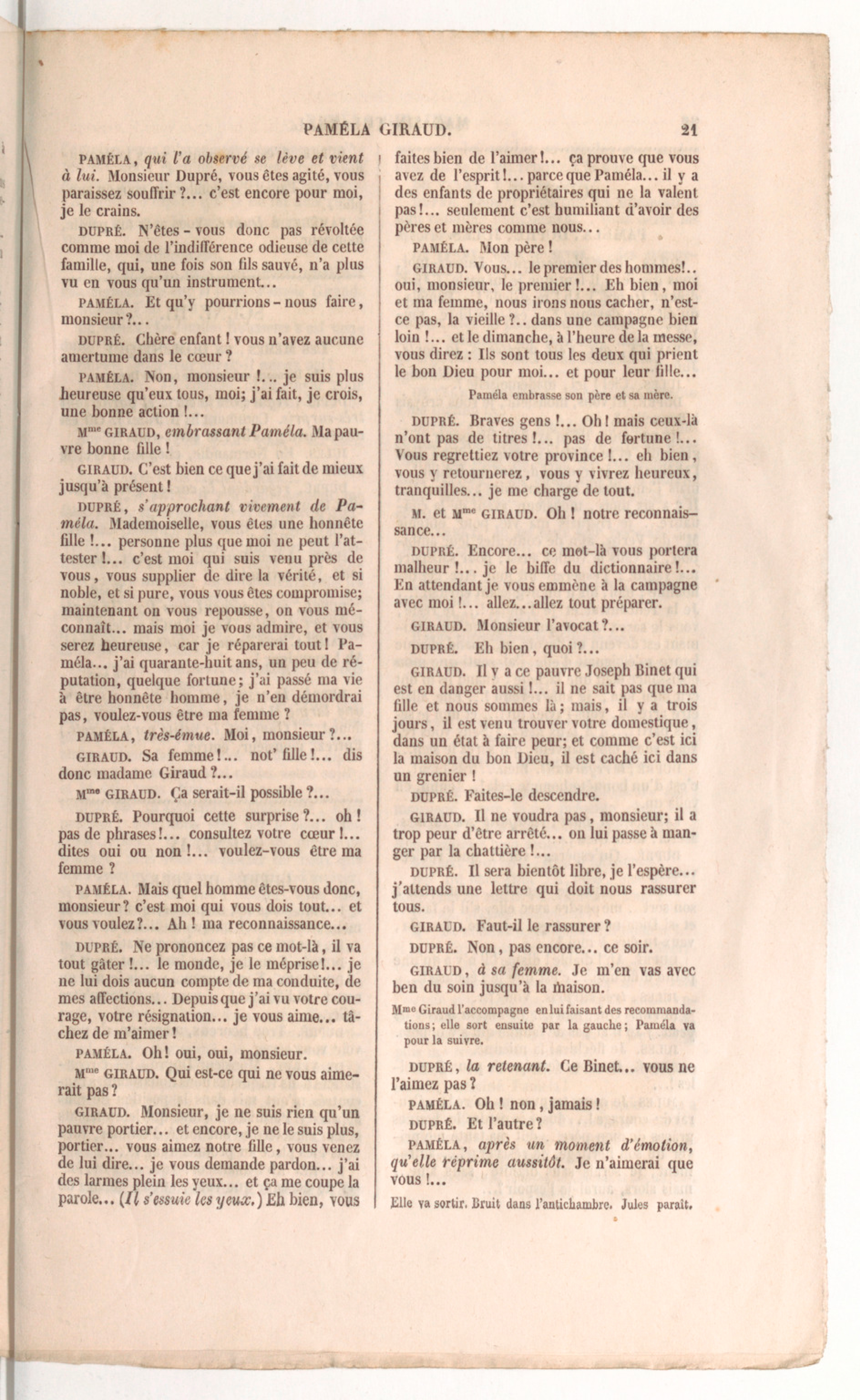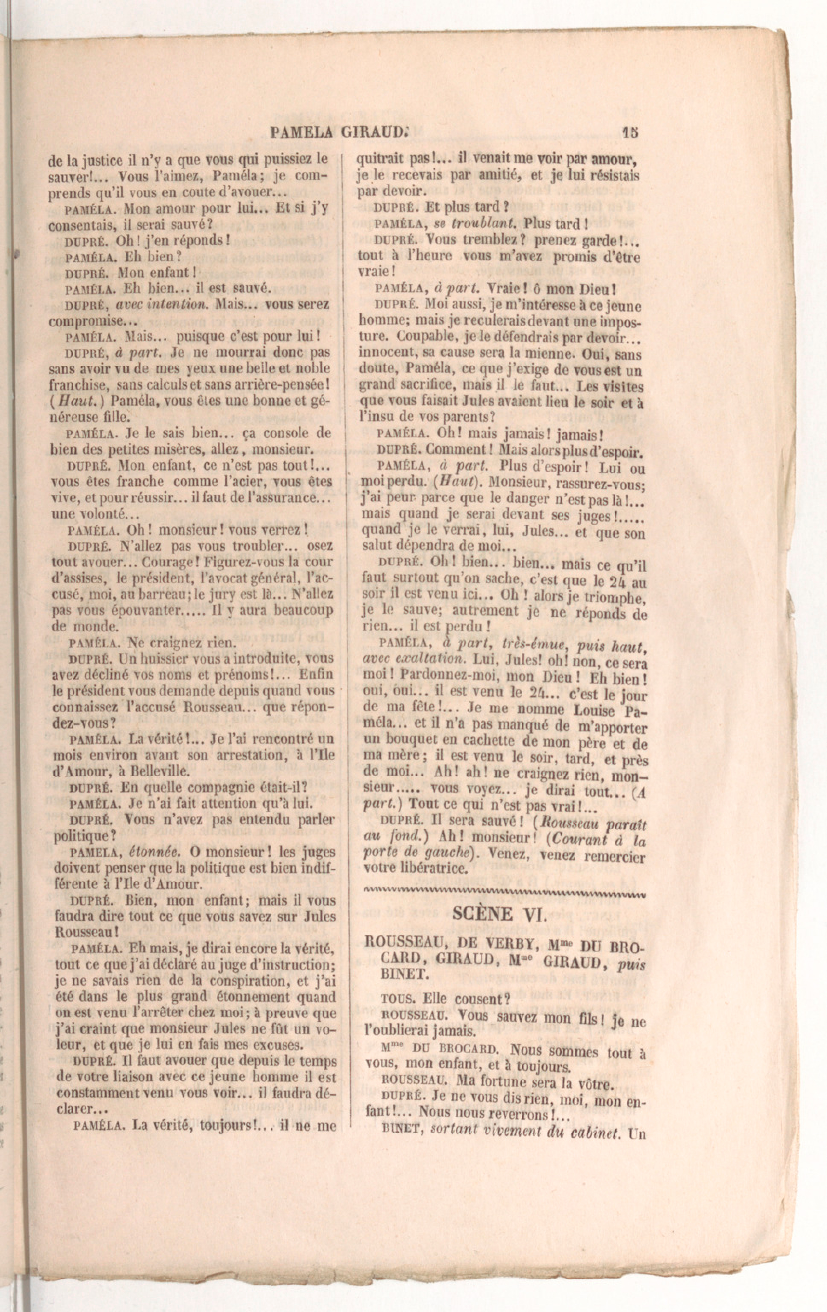 Êtes-vous contents de moi ?… (Pendant ce temps, Jules et madame Rousseau ont supplié Rousseau de se laisser fléchir ; Rousseau hésite, et finit par embrasser au front Paméla, qui s ’ est approchée en tremblant. Dupré s ’ avance vers Rousseau, et lui voyant embrasser Paméla, il lui tend la main en disant.) Bien, monsieur !… (À Jules, l’interrogeant.) Elle sera heureuse ?…
